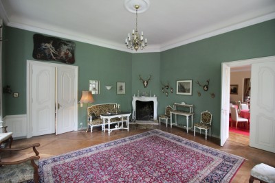 Le gran salon entèrement parqueté et éclairé par de hautes fenêtres, donne sur le parc. Il servait autrefois de salle de bal. Grâce à ses vastes dimensions (plus de 160 m²) il peut acculeilir jusq’à 150 personnes et être aménagé librement pour toutes sortes de manifestations et cérémonies. Ce salon donne par une terrasse sur le parc où l’on descend par un bel escalier en pierre à deux volées.